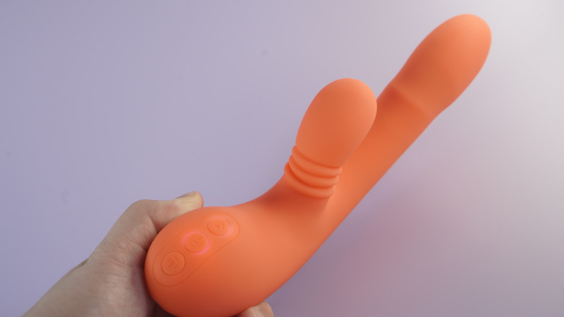 Верхняя кнопка отвечает за включение язычка в вагинальной части, нижняя вибрацию в вагинальной и клиторальной частях, единоразовым нажатием на кнопку включения можно управлять стимуляцией в клиторальной части.